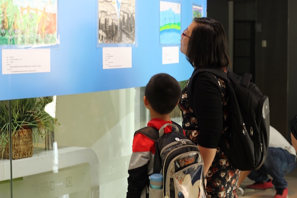 第二天下午,一起作業(yè)要在這里開一個小型的發(fā)布會,給這些孩子頒獎。兩點開始的活動,一個媽媽帶著孩子1點半就到達了現(xiàn)場,這對母子在看本次活動獲得二等獎的作品,如果不是特別說明,很難相信這張畫來自一個一年級學生。