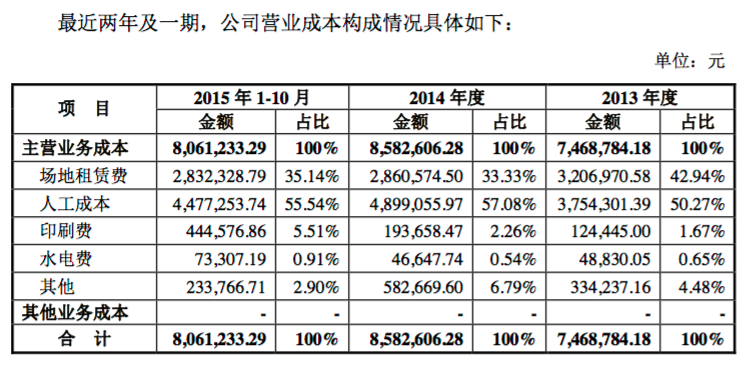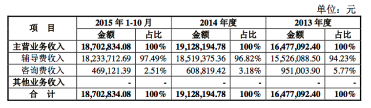 財報顯示,泰祺教育2013年、2014年、2015年1-10月營業(yè)收入分別為1647.71萬元、1912.82萬元、1870.28萬元;凈利潤分別為13.50萬元、76.59萬元、7.99萬元。