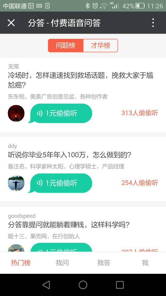 此外,回答過的問題進(jìn)入問題榜,其他用戶可以支付1元旁聽。這1元將評分給提問者跟回答者,每人各得到0.5元,看來這個設(shè)置也是在鼓勵提問者問更多有價值的問題,在這樣的機(jī)制下,問題本身受到的關(guān)注越多,提問者和回答者得到的收入也就越多。