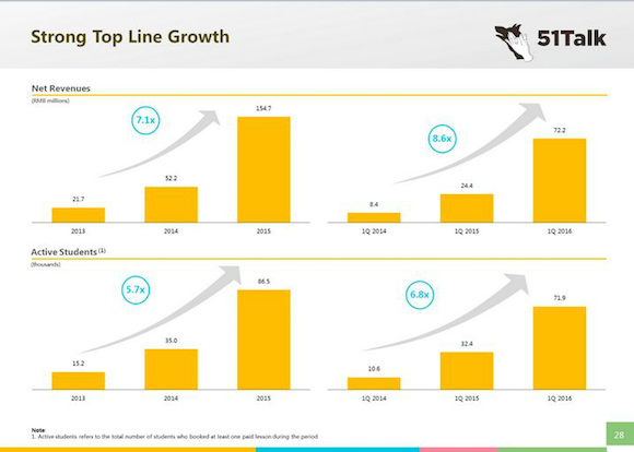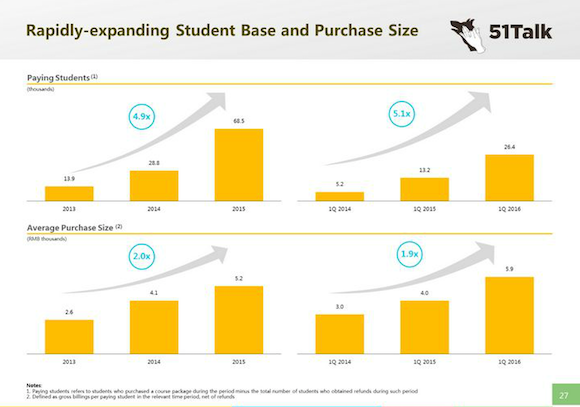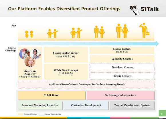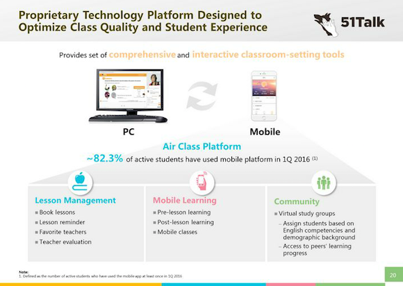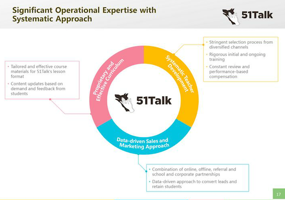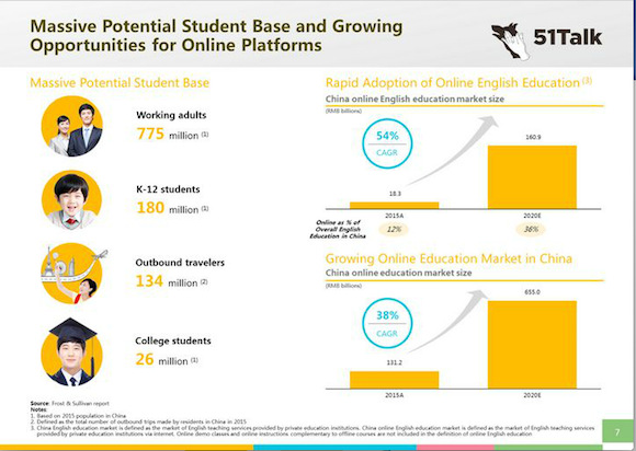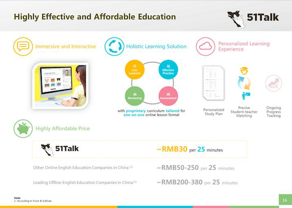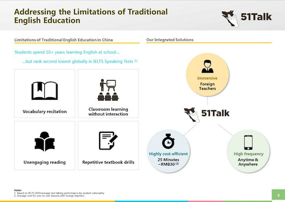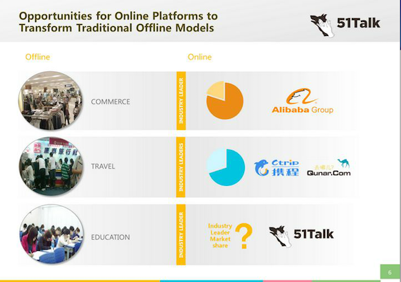 提出在線教育平臺(tái)概念,并且舉出阿里巴巴、攜程的例子,可以看出,51Talk希望用相似的互聯(lián)網(wǎng)產(chǎn)品的成功案例做概念背書。