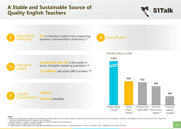 一個(gè)在中國(guó)的外教一個(gè)月薪水是1617美元,而51Talk的菲律賓外教的月薪只有536美元。