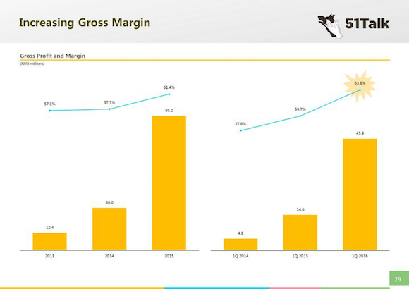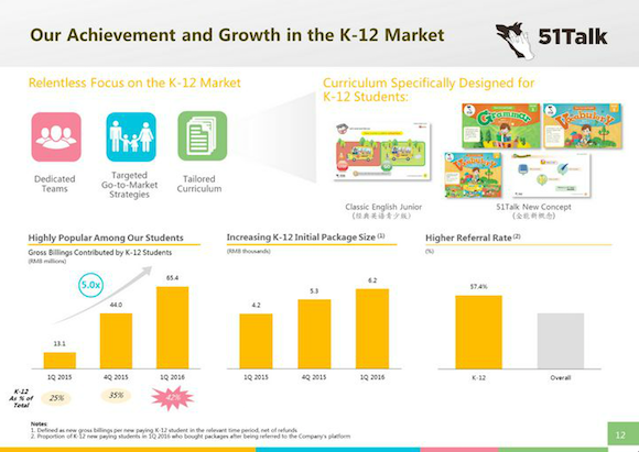 可以看出,51Talk青少業(yè)務(wù)增長(zhǎng)迅速,51Talk毛收入從2015年Q1的1310萬元增長(zhǎng)到2015年Q4的4400萬元,再到2016年的6540萬元,占當(dāng)年?duì)I收的42%。圖表顯示,K12用戶有著更高的轉(zhuǎn)介紹率,轉(zhuǎn)介紹率達(dá)到57.4%。同時(shí),每個(gè)學(xué)生的最小客單價(jià)也將變得更加貴,從2015年Q3季度的4200元漲到了2015年Q3的6200元。