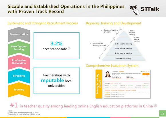這一頁(yè)主要在說老師的招聘,面試通過率為3.2%,并且51Talk和當(dāng)?shù)貙W(xué)校簽訂了協(xié)議,后者為51Talk提供穩(wěn)定的師資來源。