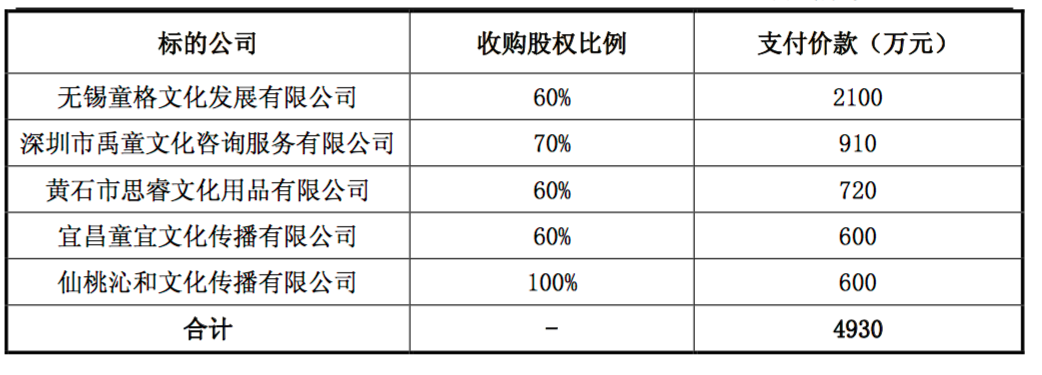 多知網(wǎng)6月13日消息,近日,億童文教發(fā)布公告稱,公司擬通過現(xiàn)金支付的方式收購 5 家經(jīng)銷商公司的部分股權(quán)。分別為無錫童格文化發(fā)展有限公司60%股權(quán)、深圳市禹童文化咨詢服務(wù)有限公司 70%股權(quán)、黃石市思睿文化用品有限公司 60%股 權(quán)、仙桃沁和文化傳播有限公司100%股權(quán),共計支付現(xiàn)金4930萬元。
