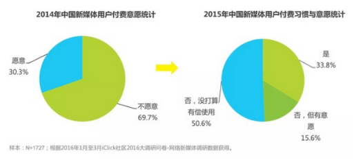 媒介方面,根據(jù)艾瑞咨詢上周剛發(fā)布的《2016年中國(guó)網(wǎng)絡(luò)新媒體用戶研究報(bào)告》,33.8%的新媒體用戶已經(jīng)產(chǎn)生過(guò)對(duì)新媒體內(nèi)容的付費(fèi)行為,15.6%的用戶有進(jìn)行付費(fèi)的意愿但是還沒(méi)有進(jìn)行付費(fèi)行為。50.6%的新媒體用戶不愿意也不打算為新媒體內(nèi)容付費(fèi),而2014年這一數(shù)據(jù)是69.7%。