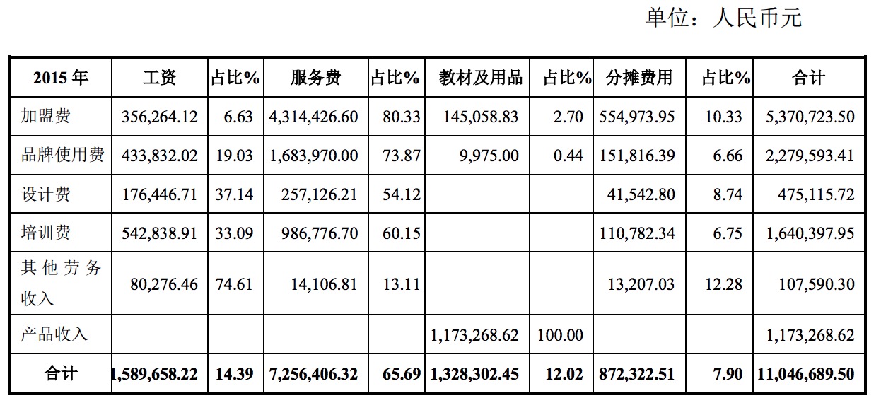 公告顯示,2015年偉才教育加盟費(fèi)為1088.5萬(wàn)元,品牌使用費(fèi)為473.9萬(wàn)元,設(shè)計(jì)費(fèi)為97.8萬(wàn)元,培訓(xùn)費(fèi)為344.9萬(wàn)元,其它勞務(wù)費(fèi)為24.2萬(wàn)元,產(chǎn)品收入為140.9萬(wàn)元。