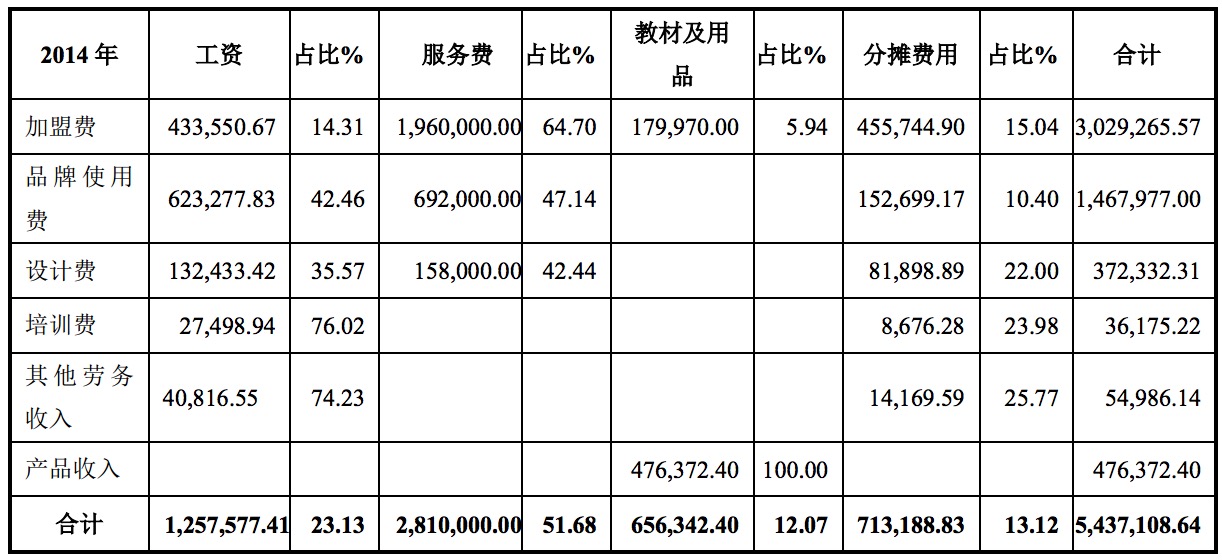 公告顯示,加盟費(fèi)中,公司 2014 年度的工資和服務(wù)費(fèi)占總營(yíng)業(yè)成本的比例與 2015 年度持平,分別為79.01%和86.97%;其中外部機(jī)構(gòu)的服務(wù)費(fèi)占比 2014 年度與 2015年度分別為 64.70%和 80.33%。品牌使用費(fèi)中,公司 2014 年度的工資和服務(wù)費(fèi)占總營(yíng)業(yè)成本的比例與 2015 年度持平,分別為 89.60%和 92.90%,其中外部機(jī)構(gòu)的服務(wù)費(fèi)占比 2014 年度與 2015 年度分別為 47.14%和 73.87%。