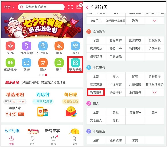 (左圖為美團(tuán)“學(xué)習(xí)培訓(xùn)”界面,右圖為大眾點(diǎn)評“學(xué)習(xí)培訓(xùn)”界面)