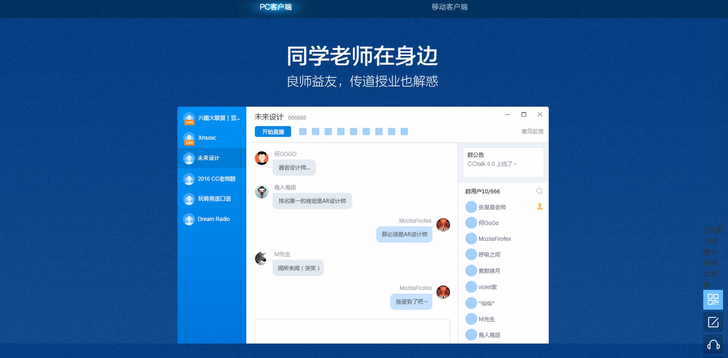 早在2012年,滬江網(wǎng)推出了CCtalk PC版,定位直播工具,服務(wù)于機(jī)構(gòu)、老師、同學(xué),支持實(shí)時公屏互動、即時課堂答題以及鮮花送名師等互動功能。