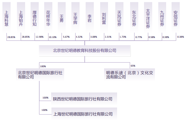 世紀明德旗下先后設立3家子公司。公司于2007年6月設立國際旅行社,主要負責公司國內外游學活動中的接待業(yè)務,包括交通、住宿、餐飲、景點門票、保險、安全等方面;2015年5月設立青青部落,主要產品是定點的主題營的體驗式活動,通過心理學、軍事、科技、體育等方面的體驗式活動鍛煉參與者的生理、心理、智力和社交能力等;2016年2月設立明德樂途,主要承接公司及其他客戶的夏令營配套物資制作、攝影擴印活動等。