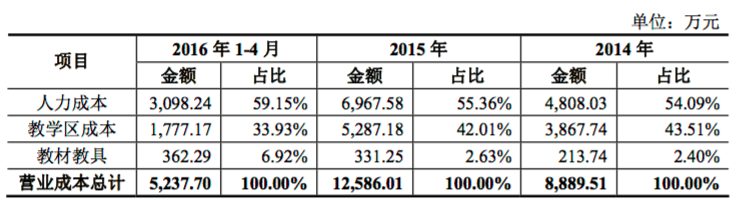 營業(yè)成本方面,高思教育營業(yè)成本構(gòu)成主要包括教師課酬、人員工資、獎金等人力成本,房屋租賃費及裝修費用等教學(xué)區(qū)成本以及購買教材教具的費用。具體成本構(gòu)成如下: