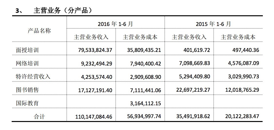 這一動作反映在財報上的表現(xiàn)是,文都教育原本是圖書銷售占到收入52.11%,轉(zhuǎn)變?yōu)槊媸谂嘤?xùn)占到收入的72.2%。