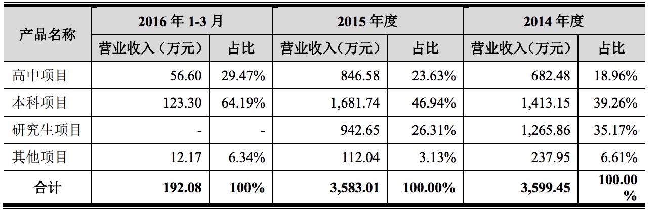 報(bào)告期內(nèi),公司業(yè)務(wù)收入全部來(lái)自留學(xué)咨詢業(yè)務(wù),即主營(yíng)業(yè)務(wù)收入占營(yíng)業(yè)收入比例為 100%。2014 年度、2015 年度、2016 年 1-3 月,公司高中項(xiàng)目、本科項(xiàng)目、研究生項(xiàng)目三類項(xiàng)目合計(jì)占比分別為 93.39%、96.87%、93.66%,這三類項(xiàng)目是公司最主要的業(yè)務(wù)收入。