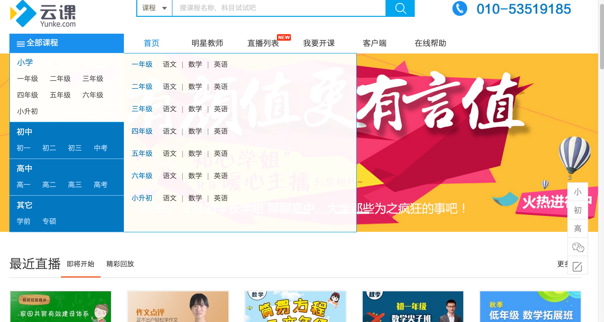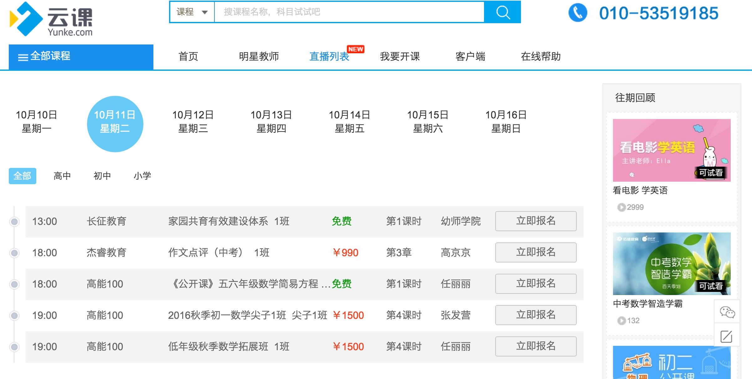 目前,云課平臺上課程類型分為三種直播課、錄播課、線下課。云課平臺上的課程是針對學(xué)前、小學(xué)、初中、高中的學(xué)生,主要包括數(shù)學(xué)、英語、語文、化學(xué)、生物、計(jì)算機(jī)、音樂、科學(xué)、閱讀、安全禮儀、美勞、培訓(xùn)、邏輯、中文寫作、專業(yè)課等21門課程。官網(wǎng)還為用戶提供了免費(fèi)課和付費(fèi)課排行版提供給用戶選擇,用戶如果錯過直播還可尋找到回放。