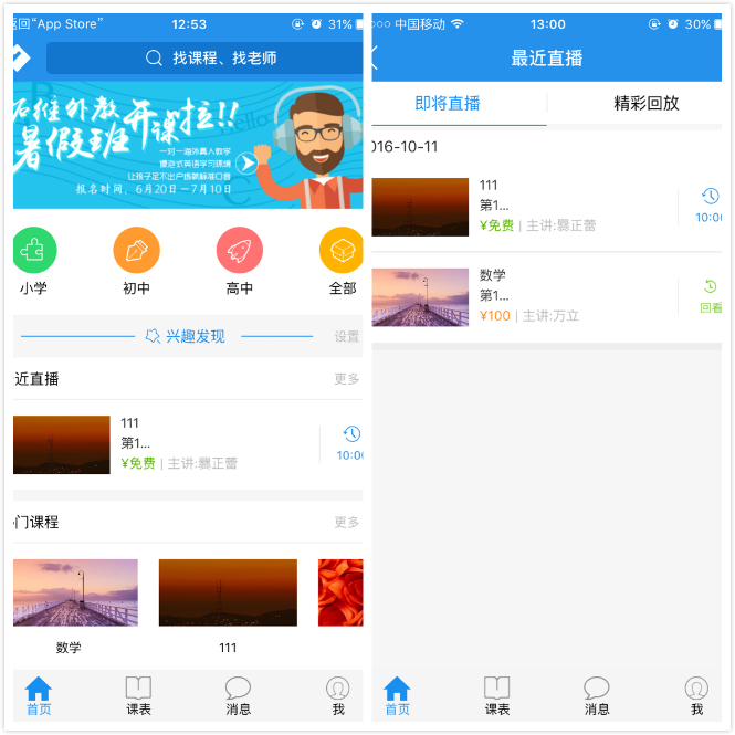 筆者注意到“直播列表”注明了特殊標(biāo)志,點(diǎn)擊發(fā)現(xiàn)頁面顯示的是各階段課程安排表,包括直播課程時間、課時、費(fèi)用、教師信息及報(bào)名通道等,課程費(fèi)用0-1500元/課時不等。此外,首頁上還提供了“我要開課”的欄目,提供給老師或機(jī)構(gòu)選擇。