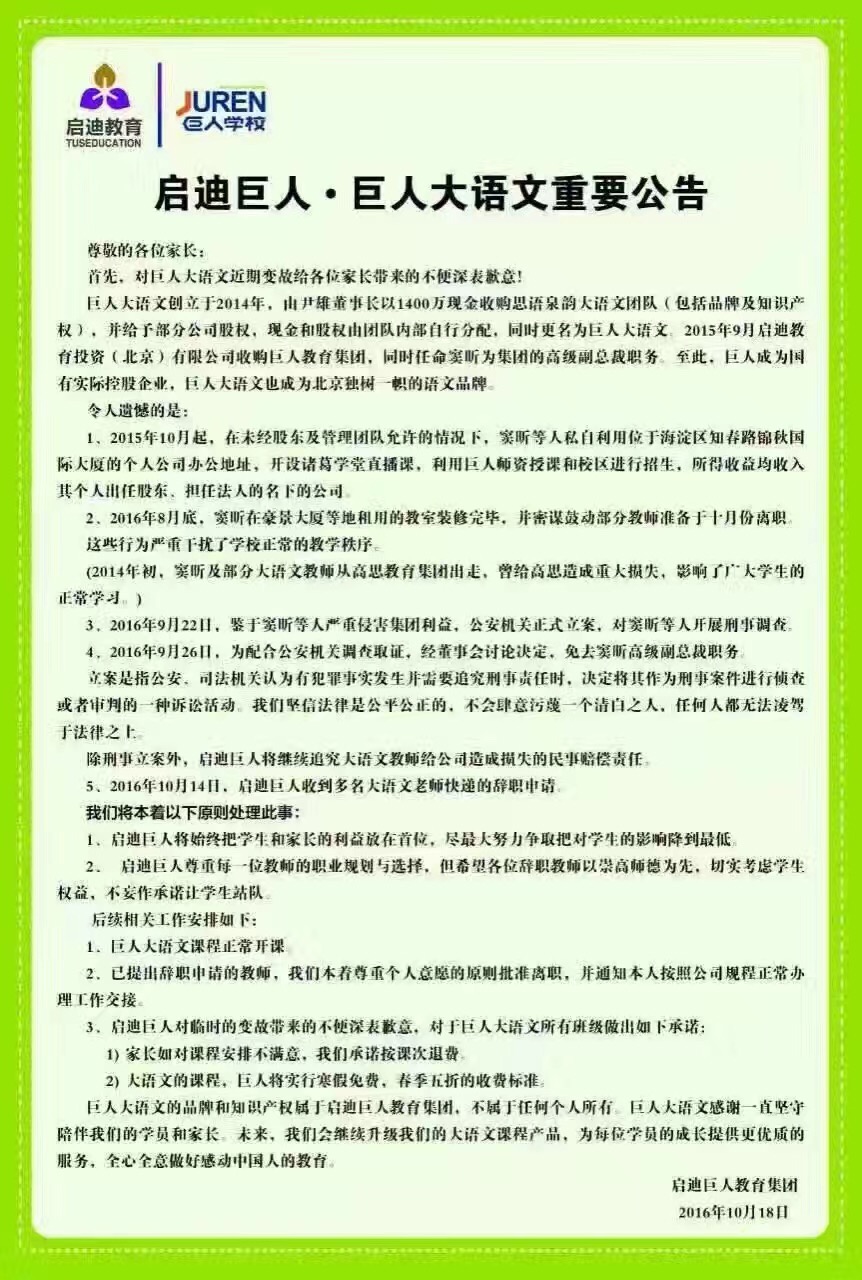 最近我們和原公司之間的一些變化,給您帶來了困惑和不便,在此致歉,請您見諒。這段日子里,我們的內(nèi)心充盈著感動和感激,感謝大家對于大語文團隊一如既往的信任和支持。九月,發(fā)生了竇老師向原公司提交辭呈、原公司向公安系統(tǒng)報案說竇老師涉嫌職務(wù)侵占兩件事,手段一般。據(jù)律師告知,天日昭昭,在京城,再強大的力量也并不能使沒有違法犯罪的人失去自由,相信清白之日竇老師會為自己的名譽維權(quán)。我們?nèi)涨耙惨呀?jīng)正式提交了辭職報告,想為了自己奮斗。面臨變化,我們呼吁原公司念在大語文團隊對公司的拯救之功與從教者的基本原則,不因經(jīng)濟利益而犧牲學(xué)習(xí)效果,不要隨意打亂孩子們的學(xué)習(xí)進度。致力于此,大語文團隊會義務(wù)保障課程能無縫鏈接,上課地點也盡力選在現(xiàn)有教學(xué)點附近。由于變動會給孩子們前幾次上課帶來不適應(yīng),為答謝廣大學(xué)生和家長對大語文團隊老師的信任,這幾次課我們會義務(wù)上,不收取任何費用。并且將來開業(yè)之日,優(yōu)先為老學(xué)員預(yù)留名額。相信原公司也會有妥善的安排,我們不主動從原機構(gòu)拉扯學(xué)生、擴大原機構(gòu)的損失,祝福原機構(gòu)在清除異見者之后,做良心教育,切實感動中國人,能為家長學(xué)生著想,能走得更遠(yuǎn)。之后具體的課程安排依據(jù)與原公司協(xié)商結(jié)果而定,目前老師們?nèi)詴谠窘虒W(xué)點上課,有結(jié)果會及時通知,請大家留意各班級微信群。青山不改,綠水長流,相濡以沫或者相忘于江湖。