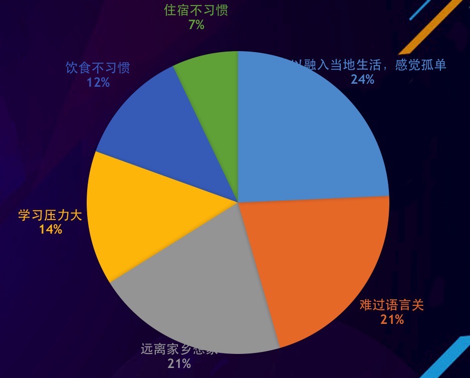 難過語言關(guān)和遠(yuǎn)離家鄉(xiāng)想家占比相同為21%。