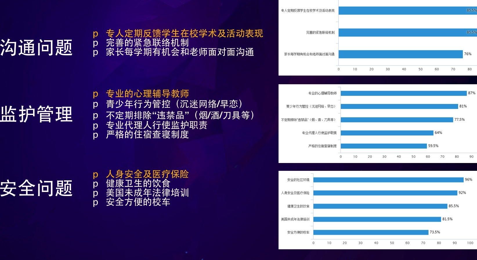 在溝通問題上,專人定期反饋學(xué)生在校學(xué)術(shù)及活動表現(xiàn)和完善的緊急聯(lián)絡(luò)機制占比相同為85.5%。