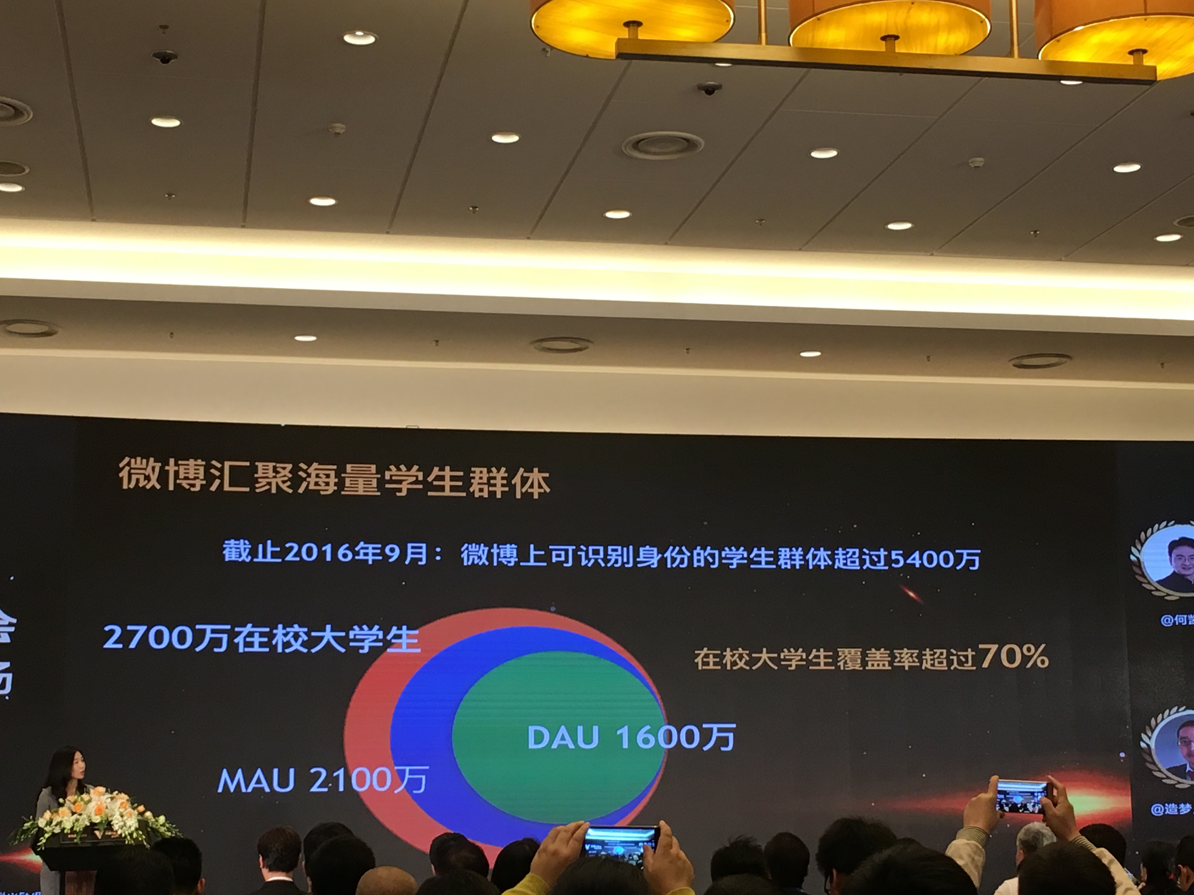 截止到2016年9月,微博覆蓋的可識別身份的學(xué)生群體達(dá)到了5400萬人,其中有2700萬的在校大學(xué)生。