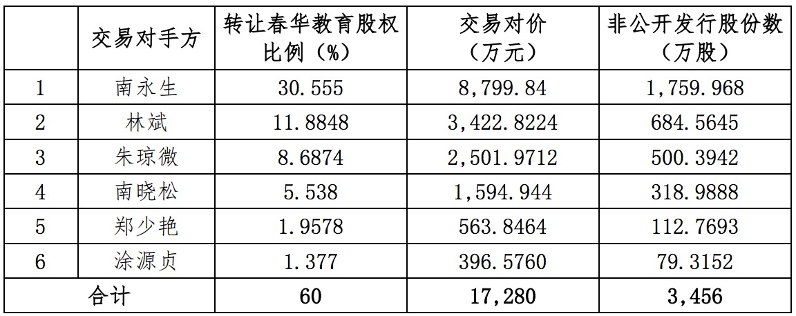2016年11月14日,公司與春華教育股東南永生、林斌、朱瓊微、南曉松、鄭少艷和涂源貞 6 名自然人(以下簡(jiǎn)稱“交易對(duì)手方”)共同簽署了附條件生效的《發(fā)行股份購(gòu)買(mǎi)資產(chǎn)協(xié)議》。