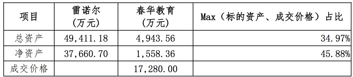 公告披露雷諾爾2015 年度經(jīng)審計(jì)總資產(chǎn)、凈資產(chǎn)數(shù)額及春華教育最近一期經(jīng)審計(jì)總資產(chǎn)、凈資產(chǎn)占比情況如下: