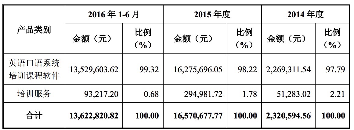 報(bào)告期內(nèi),公司營(yíng)業(yè)收入來(lái)自于跨平臺(tái)英語(yǔ)口語(yǔ)系統(tǒng)培訓(xùn)課程軟件的銷(xiāo)售和相關(guān)培訓(xùn)服務(wù)。其中,英語(yǔ)口語(yǔ)系統(tǒng)培訓(xùn)課程軟件2014年、2015年、2016年 1-6月?tīng)I(yíng)業(yè)收入分別為226.93萬(wàn)元、1627.57萬(wàn)元、1352.96萬(wàn)元;培訓(xùn)服務(wù)2014年、2015年、2016年1-6月?tīng)I(yíng)業(yè)收入分別為5.13萬(wàn)元、29.5萬(wàn)元、9.32萬(wàn)元。
