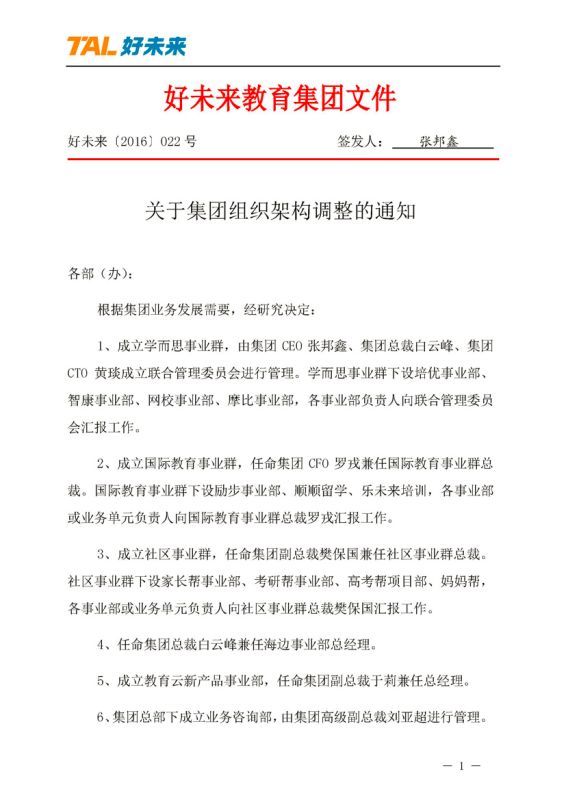 通知顯示,學(xué)而思事業(yè)群下設(shè)培優(yōu)事業(yè)部、智康事業(yè)部、網(wǎng)校事業(yè)部和摩比事業(yè)部,由好未來集團(tuán)CEO張邦鑫、總裁白云峰、CTO黃琰成立聯(lián)合管理委員會進(jìn)行管理。