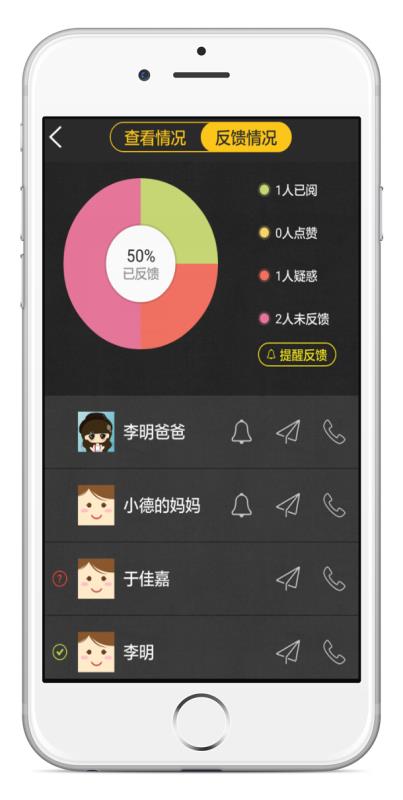 30分鐘內(nèi)未查看的家長,系統(tǒng)將自動推送提醒短信,教師可以看到哪些家長未反饋。曉黑板還提供一鍵免費語音電話提醒,從而避免家長漏看通知。
