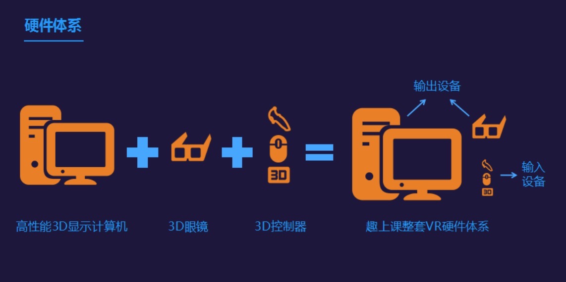 硬件體系是由若干學生、老師使用的VR設備組成。在學生端,一套供學生使用的設備由三部分組成:佩戴設備(VR眼鏡和VR遙控筆)、VR一體機、VR軟件和課件系統(tǒng), 在教師端,老師還有一套額外的支持3D顯示的投影設備以便演示和講演。趣上課的硬件體系如下圖所示: