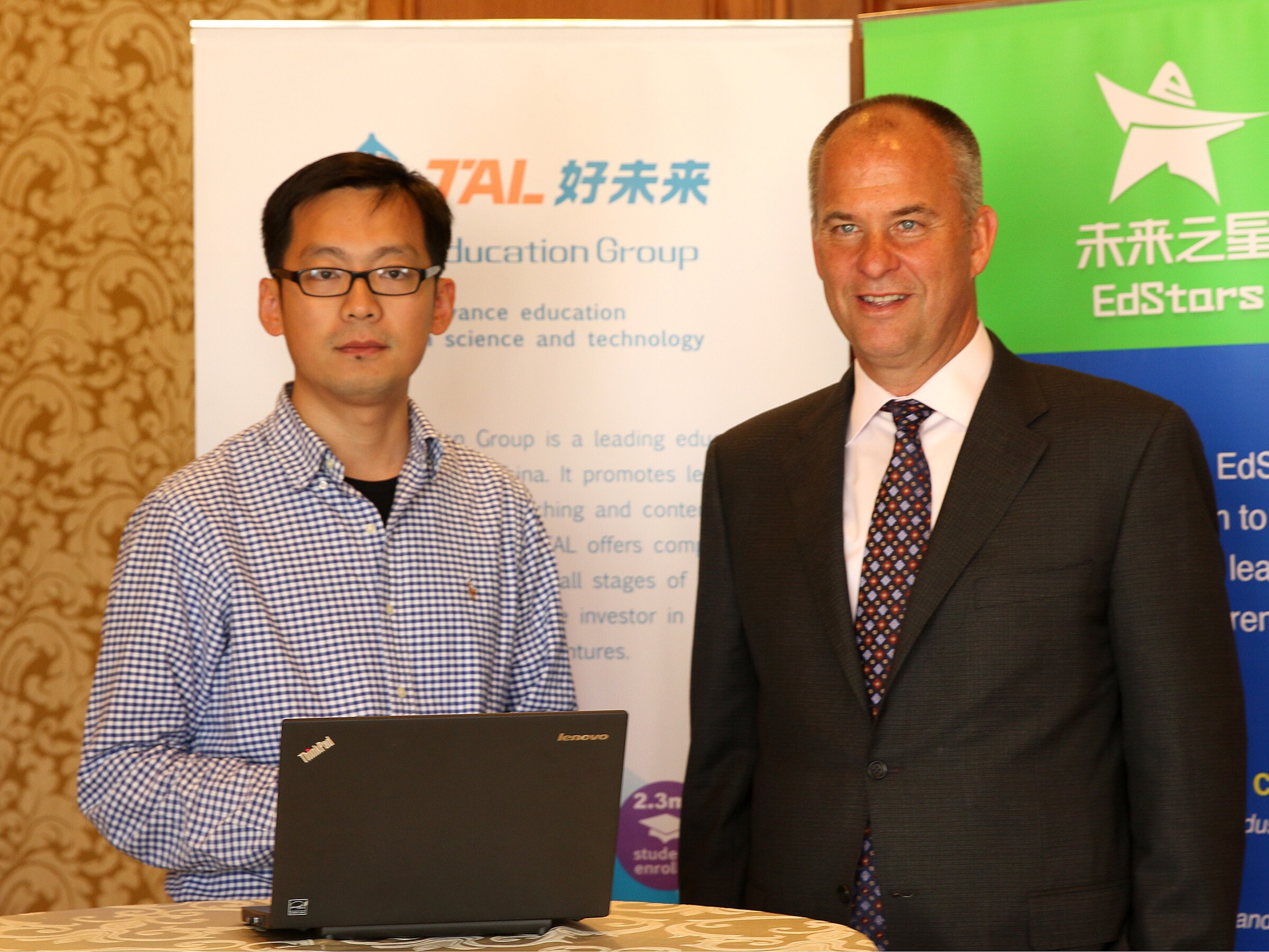 圖為好未來CTO黃琰向GSV創(chuàng)始人邁克爾?莫伊展示人臉識別技術(shù)