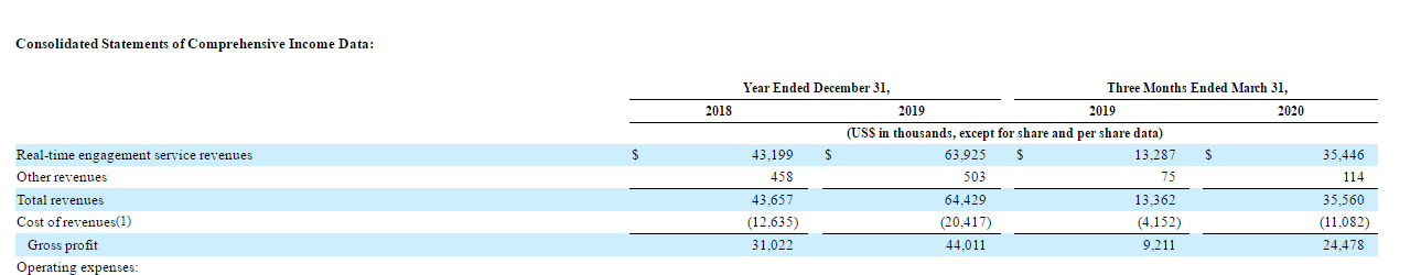 招股書顯示,聲網(wǎng)Agora營收從2018年的4,366萬美元,增長至2019年的6,443萬美元,增幅48%。2020年第一季度營收3,556萬美元,比2019年第一季度的1,336萬美元兌增166%。