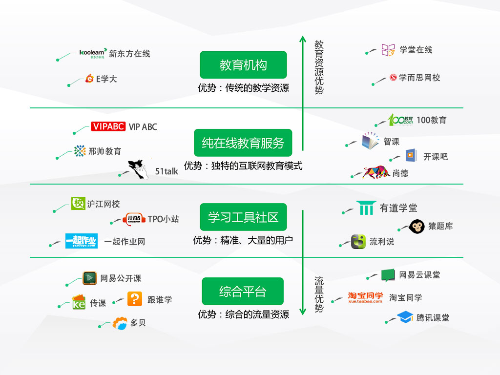 第一類,傳統(tǒng)教育機構(gòu)的優(yōu)勢,是厚實的教學資源和多年積累的品牌。面臨的挑戰(zhàn)是如何解決線上、線下博弈的問題。以及怎樣打造優(yōu)秀的互聯(lián)網(wǎng)產(chǎn)品的能力。