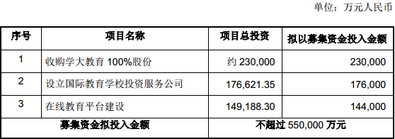 除了將約23億元用于收購(gòu)學(xué)大100%股份外,這部分資金還將用于設(shè)立國(guó)際教育學(xué)校投資服務(wù)公司以及在線教育平臺(tái)建設(shè)。具體如下表: