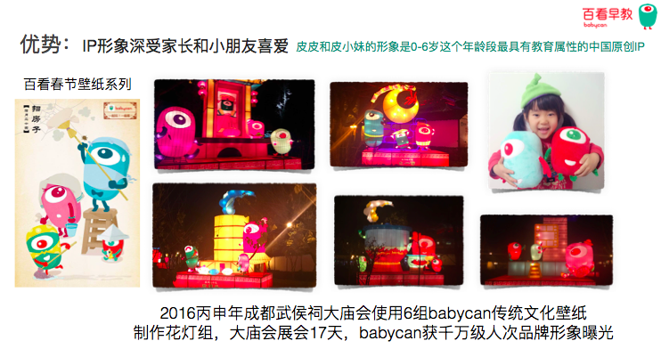 春節(jié)的時候發(fā)生了一件事情,讓我們覺得既欣慰也是略有一些遺憾。應(yīng)該是2015年2月份,臘月23到正月初五,做了30張春節(jié)壁紙,就是用我們的形象把民間的歌謠重新進行了詮釋和演繹,充滿了輕松幽默親子之間的情感傳遞。今年2016年春節(jié)的時候,群里面有一個四川的家長給我們發(fā)了很多照片,說“老師看看是不是皮皮和皮小妹一家”,我們才發(fā)現(xiàn)原來今年成都的武侯祠大廟會,把我們一年前做的春節(jié)壁紙的系列做成了2人多高的燈車,他們做這個事的時候沒有找到我們,沒有跟我們分點版權(quán)使用的費用。欣慰的地方是,這是一個品牌的曝光,它其實對于IP形象的一個二次演繹和傳播。
