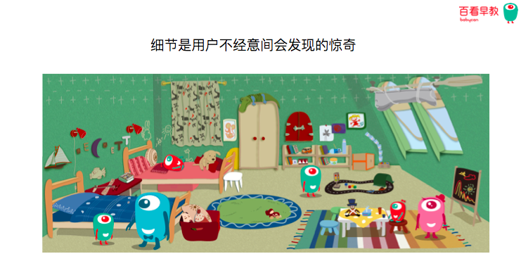 這個場景中掛在墻上的圖怎么來的,我們征集了自己用戶的作品,我們自己用戶的孩子畫的作品掛在這里面的墻上。這就是孩子自己畫的,大家可以看到這個位置,這是我們其中一個親子游戲所涉及到的材料,咱們跟孩子在家玩會發(fā)現(xiàn),很多東西不是玩完就收。這些細節(jié)我們不會告訴家長就是什么,但是他會偶爾在某一個片子當中會發(fā)現(xiàn)這些,孩子也會發(fā)現(xiàn)這些,就會覺得有一種甜蜜的感覺。