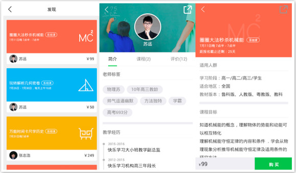 從教師介紹來看,現(xiàn)在開課的三位老師過往的經(jīng)歷分別包括原新東方、作業(yè)幫以及快樂學(xué)習(xí)。