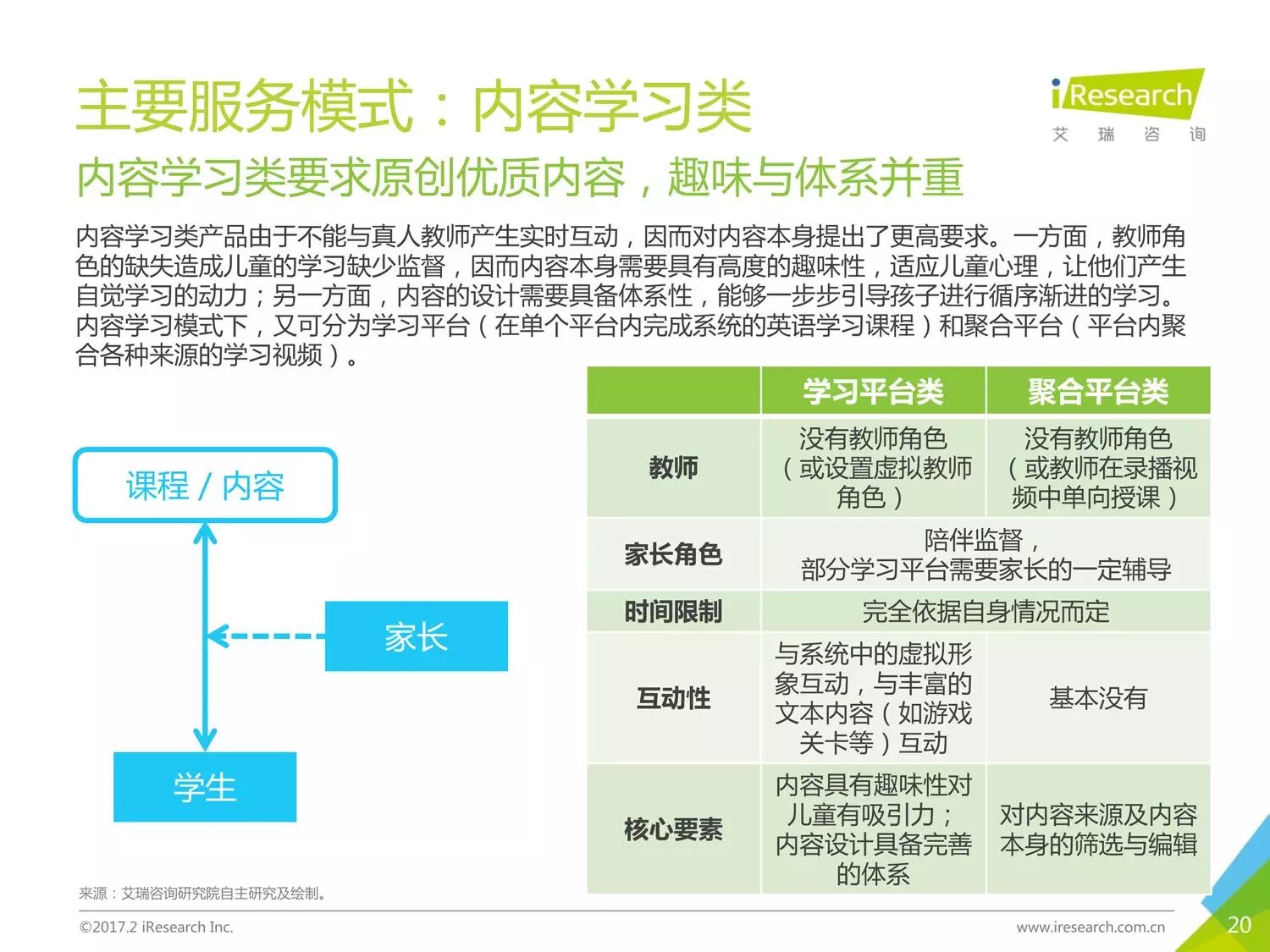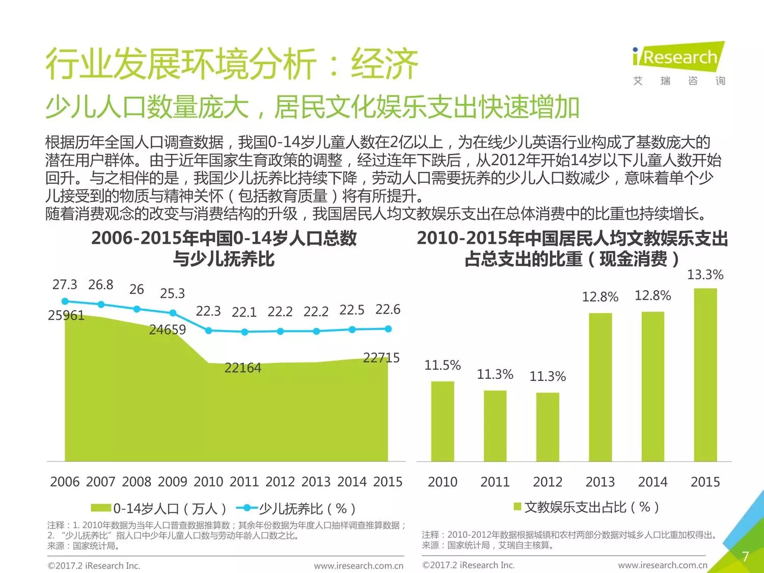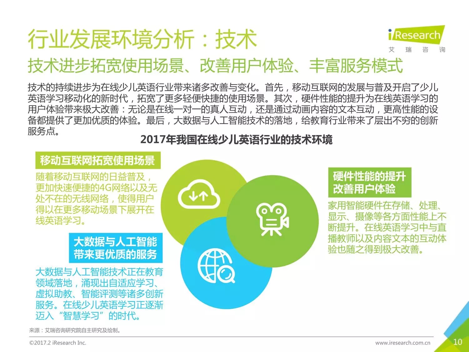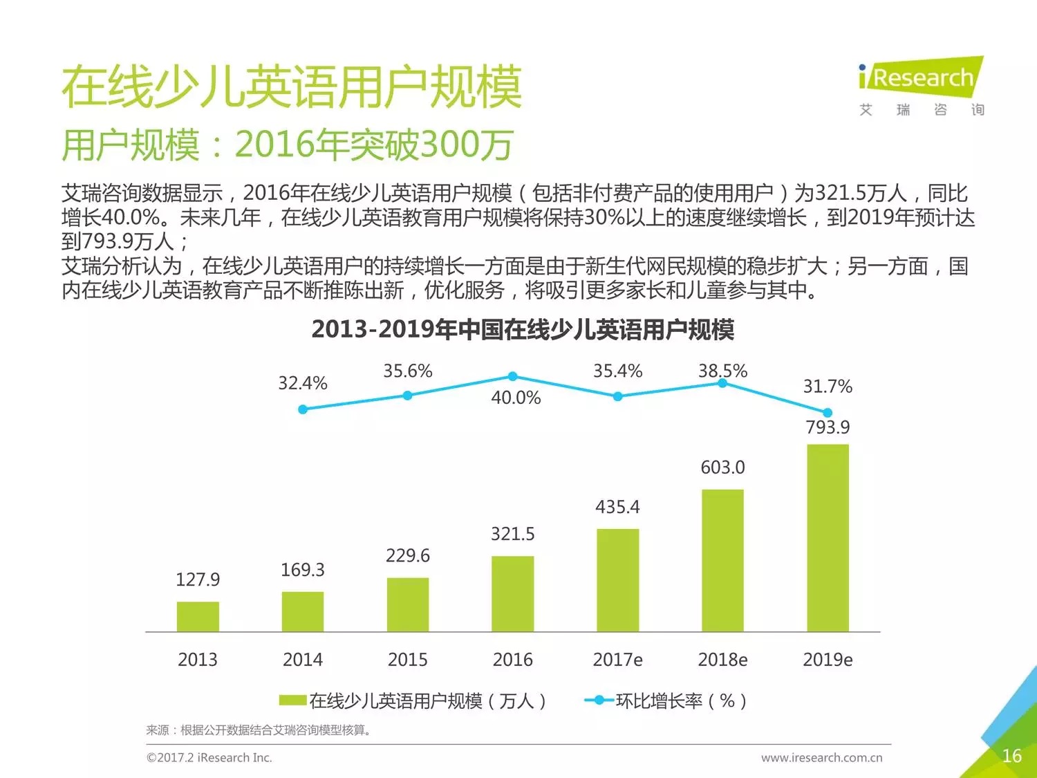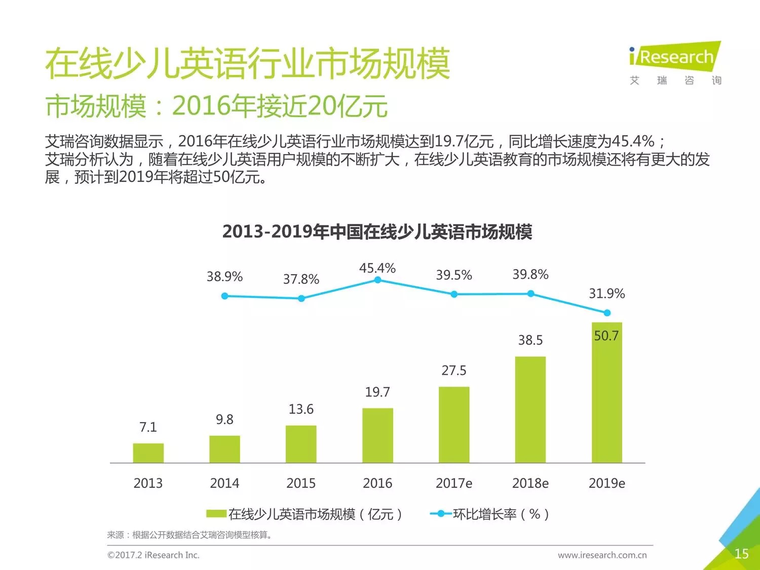 編者按:在線少兒英語(yǔ)一直是教育領(lǐng)域內(nèi)的熱門賽道,2016年在線少兒英語(yǔ)的市場(chǎng)規(guī)模接近20億,用戶規(guī)模突破300萬(wàn)。伴隨著高新技術(shù)的誕生與互聯(lián)網(wǎng)服務(wù)的提高,直播、VR等服務(wù)也滲透到了這個(gè)市場(chǎng)。隨著資本的大量涌入,競(jìng)爭(zhēng)也愈加激烈起來(lái)。本報(bào)告以時(shí)下幾家比較受關(guān)注的公司為聚焦點(diǎn),闡述了現(xiàn)在線少兒英語(yǔ)的發(fā)展?fàn)顩r。