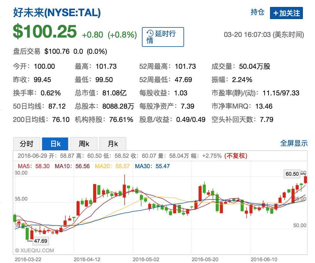 好未來以100.25美元收盤,創(chuàng)歷史新高,總市值為81.08億美元。
