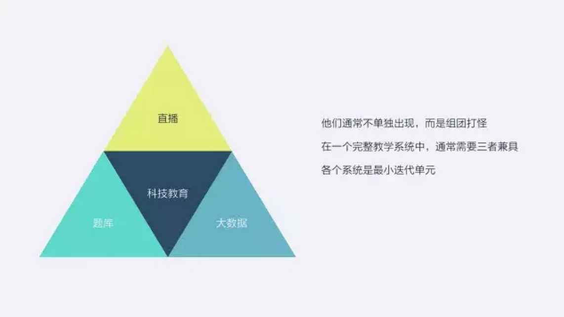 我們主要分享教育的數(shù)據(jù)延伸所帶來的變化,以及我們的具體實(shí)踐。數(shù)據(jù)是最終的結(jié)果,但是光靠數(shù)據(jù)不足以撐起第三代教育機(jī)構(gòu),還有兩個(gè)強(qiáng)有力的助手,一個(gè)是直播,一個(gè)是題庫。其中,直播是肌肉,題庫是經(jīng)絡(luò),數(shù)據(jù)是大腦。