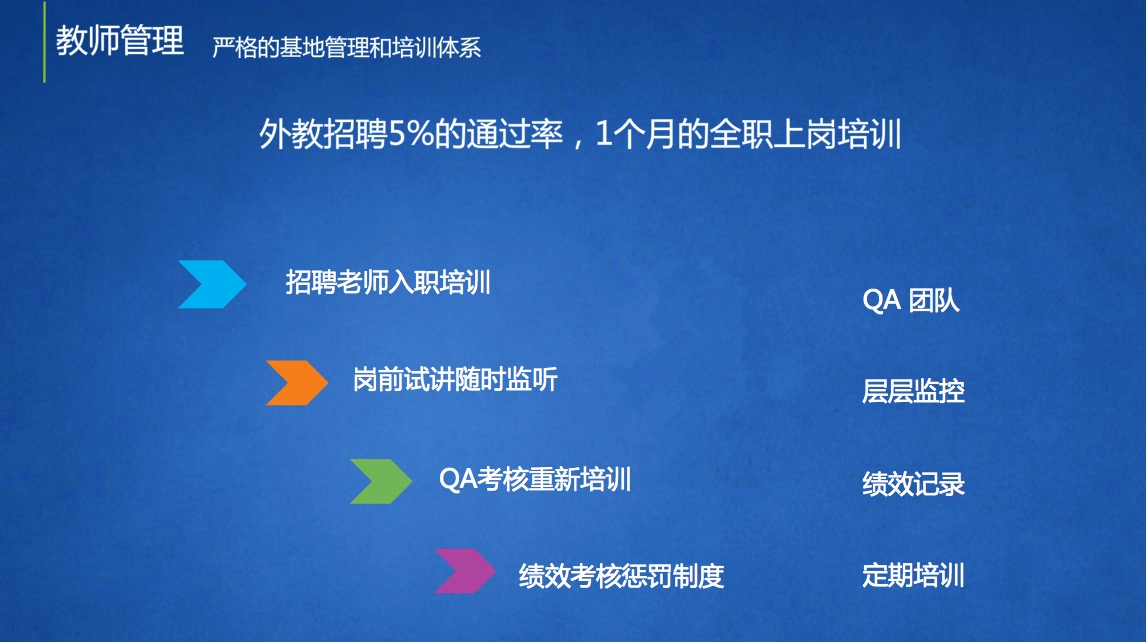 培訓(xùn)對(duì)我們來(lái)說是非常重要的環(huán)節(jié)。普通的老師在上課之前有我們會(huì)給他將近一個(gè)月的培訓(xùn)時(shí)間。第一、二周是老師基礎(chǔ)培訓(xùn);第三周的時(shí)候會(huì)進(jìn)行項(xiàng)目培訓(xùn),并且會(huì)參加項(xiàng)目面試和模擬項(xiàng)目面試;到了第四周,我們會(huì)對(duì)老師進(jìn)行運(yùn)營(yíng)培訓(xùn),并且根據(jù)項(xiàng)目面試的反饋,加強(qiáng)專業(yè)培訓(xùn)。