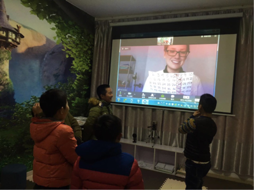 清成美國外教小班課并不是典型的雙師課堂。在清成的課堂上,中國助理(TA)只負(fù)責(zé)維護(hù)課程秩序,為在線美國外教(OT)、學(xué)生(Ss)提供課程材料。OT主導(dǎo)課堂,學(xué)生直接在OT的指揮下,在實(shí)體教室進(jìn)行學(xué)習(xí),例如身體活動(dòng)、游戲、故事表演、小組競(jìng)爭(zhēng)、通過各種教學(xué)玩具進(jìn)行學(xué)習(xí)。