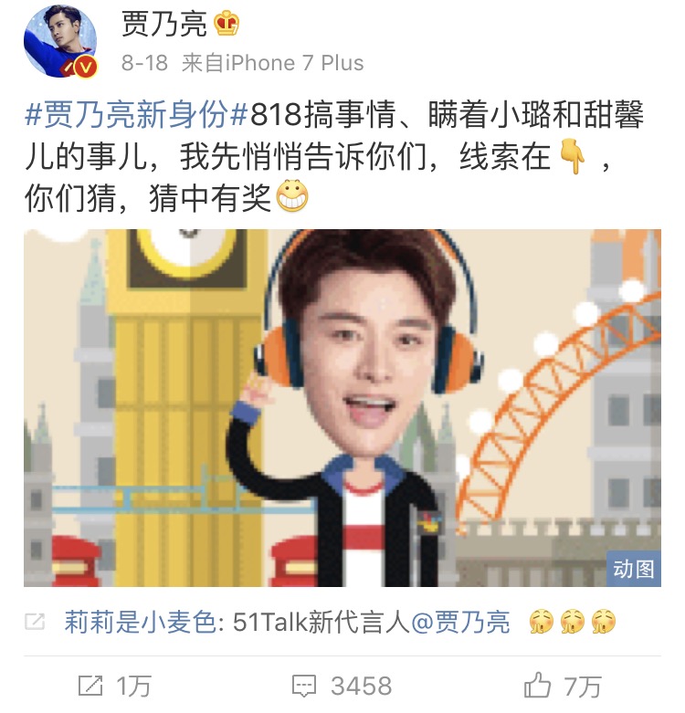 兩天前在賈乃亮官方微博就有一段#賈乃亮新身份#的內(nèi)容發(fā)布出來,而有評論直接“劇透”其將成為51Talk最新代言人。剛剛51Talk方面也已證實(shí)了這個猜測。