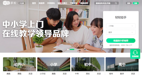 今年,年輕輕家教完成品牌升級(jí),新的品牌定位為中小學(xué)上門、在線教學(xué)品牌,明確核心業(yè)務(wù)從上門1對(duì)1輔導(dǎo)擴(kuò)展至上門、在線個(gè)性化輔導(dǎo),并推出在線課“放心老師”。目前,輕輕家教的業(yè)務(wù)涵蓋幼升小、小學(xué)和初高中的各項(xiàng)輔導(dǎo)業(yè)務(wù)。