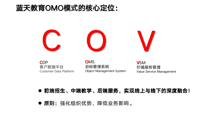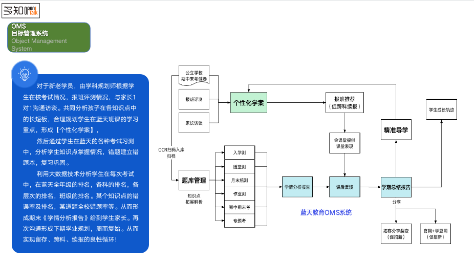 整個(gè)OMO落地的定位分三部分,第一部分是前端招生,我們注重于客戶的數(shù)據(jù)管理,也就是說更注重于學(xué)生畫像。中端是目標(biāo)管理系統(tǒng),注重于客戶的目標(biāo)、教學(xué)的目標(biāo)和經(jīng)營(yíng)的目標(biāo)這三大目標(biāo)。后端服務(wù)更多是指為客戶提供更多的價(jià)值服務(wù)。