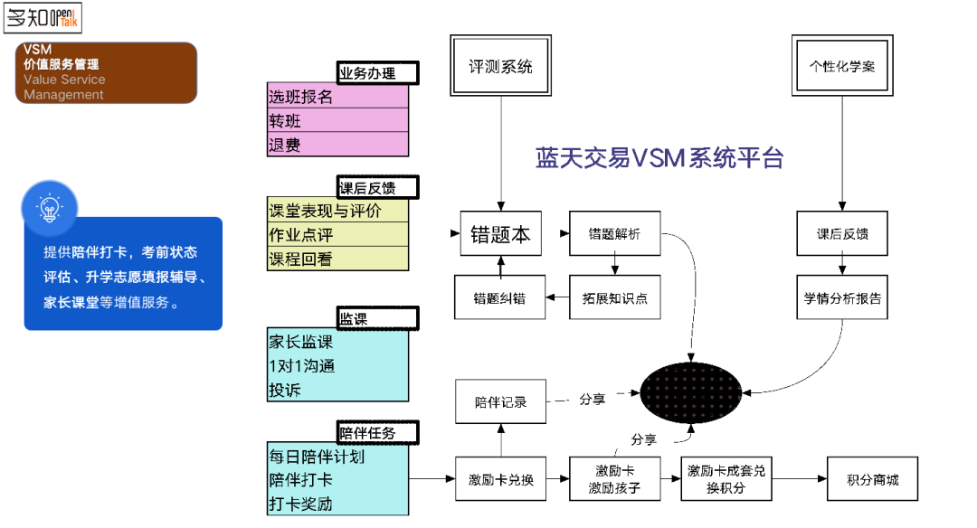 第三板塊是VSM價(jià)值服務(wù)管理。服務(wù)體系無非就是家長(zhǎng)的業(yè)務(wù)辦理,比如報(bào)名收費(fèi)、轉(zhuǎn)班、退費(fèi)申請(qǐng)、開票等等,我們的家長(zhǎng)監(jiān)課功能也在這里,同時(shí)我們會(huì)有一個(gè)陪伴任務(wù),我們?nèi)蝿?wù)教育不只是老師和學(xué)生之間,還有一個(gè)家長(zhǎng)環(huán)節(jié),同時(shí)家長(zhǎng)的黏性我們也要做。怎么辦?我們做了一個(gè)家長(zhǎng)陪伴任務(wù)的打卡。也就是說,我們針對(duì)孩子的年齡段會(huì)做一些陪伴任務(wù),這個(gè)陪伴任務(wù)家長(zhǎng)也可以自定義,我們也可以推薦一個(gè)優(yōu)秀的陪伴計(jì)劃,家長(zhǎng)也是要每天打卡。當(dāng)你打卡堅(jiān)持比如一周的時(shí)間我給他激勵(lì)卡,他可以把激勵(lì)卡送給孩子,寫一個(gè)寄語,當(dāng)積到一套的時(shí)候可以換購(gòu)一個(gè)課程,希望家長(zhǎng)也夠參與到對(duì)孩子的陪伴過程。除此之外,我們還有一個(gè)考前狀態(tài)的評(píng)估,可以直接在線上做,同時(shí)可以對(duì)升學(xué)志愿的填報(bào)可以做一對(duì)一的輔導(dǎo),還有家長(zhǎng)課堂的增值服務(wù)。