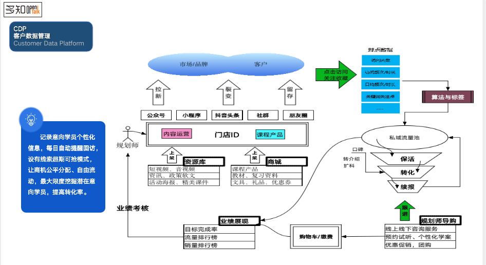 第一是CDP(客戶數(shù)據(jù)平臺(tái))。這個(gè)平臺(tái)更多是以客戶的畫像為主,并不是說客戶跟進(jìn),跟進(jìn)是其中一部分。在這種情況下,我們完成的是整個(gè)數(shù)據(jù)采集,包括一些實(shí)時(shí)數(shù)據(jù)的歸集和統(tǒng)一用戶流量池管理,在這種情況下我們可以給用戶打標(biāo)簽、做畫像,然后精準(zhǔn)地去營(yíng)銷。