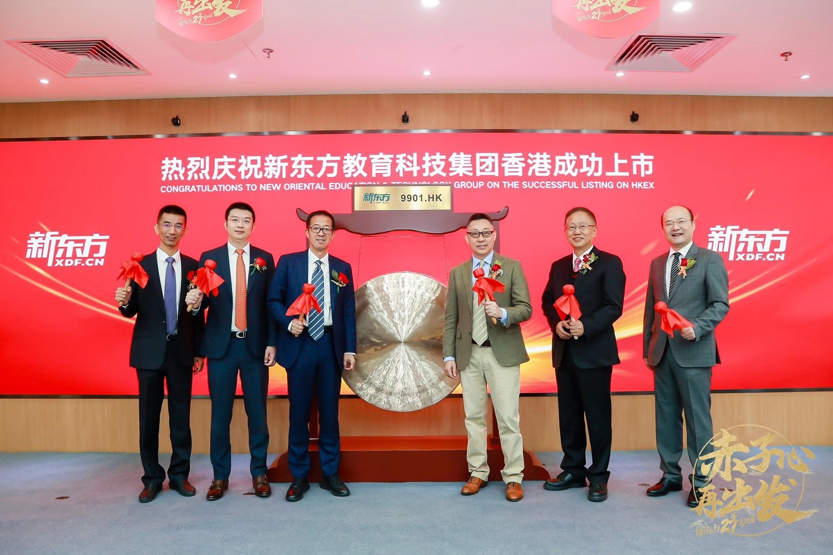 今日,新東方創(chuàng)始人兼董事長(zhǎng)俞敏洪帶團(tuán)隊(duì)在內(nèi)部進(jìn)行“云敲鐘”,主題為“赤子心,再出發(fā)”,藉此,新東方正式回歸港股,在港交所二次上市,開盤價(jià)1381港元,較發(fā)行價(jià)1190港元漲16.05%,是港股首支千元股,且市值超2252.98億港元。