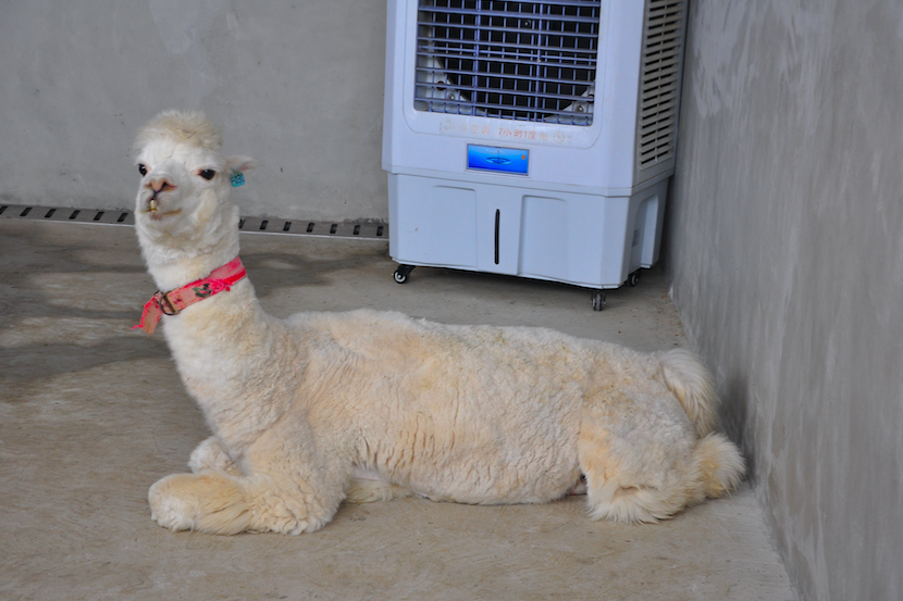 去看神獸羊駝的時候,它正愜意滴趴在地上吹空調(diào)?;蛟S是最近太熱,羊駝歐巴心情不夠美麗,看見人來了都懶得展示它的朋克造型,只是鄙夷地瞅了兩眼。