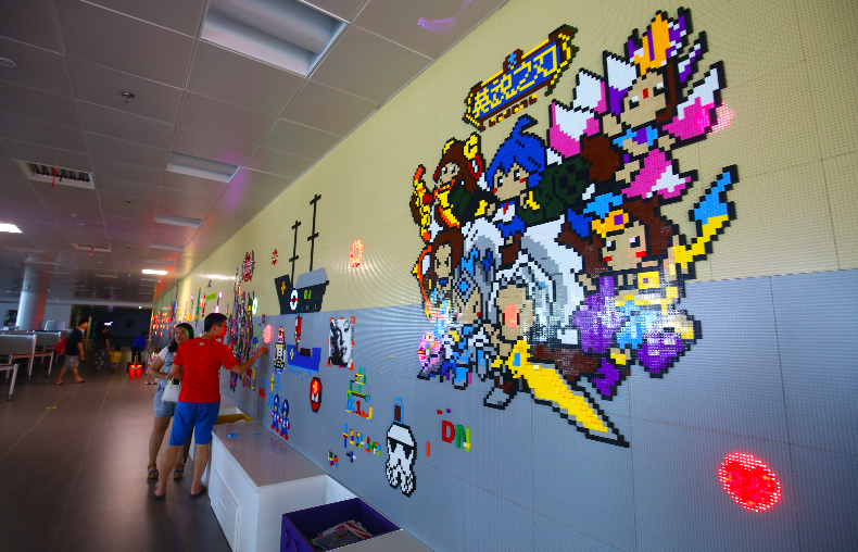(樂高墻,下面的積木盒子可供員工自由發(fā)揮,包含近十年的樂高成規(guī)模各個版本都有,及部分停產(chǎn)、稀有零件)