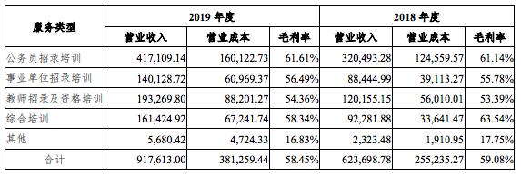 中公披露了其主營(yíng)業(yè)務(wù)的營(yíng)業(yè)收入、營(yíng)業(yè)成本及毛利率。其主營(yíng)業(yè)務(wù)包括公務(wù)員招錄考試培訓(xùn)、事業(yè)單位招錄考試培訓(xùn)、教師招錄及教師資格考試培訓(xùn)、綜合類考試培訓(xùn)(如醫(yī)療衛(wèi)生系列、金融銀行系列、考研培訓(xùn)、IT 技能培訓(xùn)等)四大類。